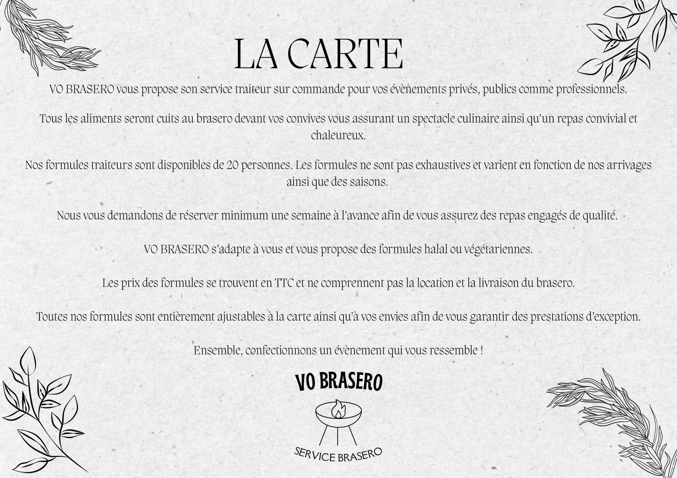 Particulier, entreprise, association : pour un simple repas conviviale ou un évènement inoubliable ? Chez VO BRASERO, on s’occupe de tout — vous n’avez plus qu'à déguster et profiter !
